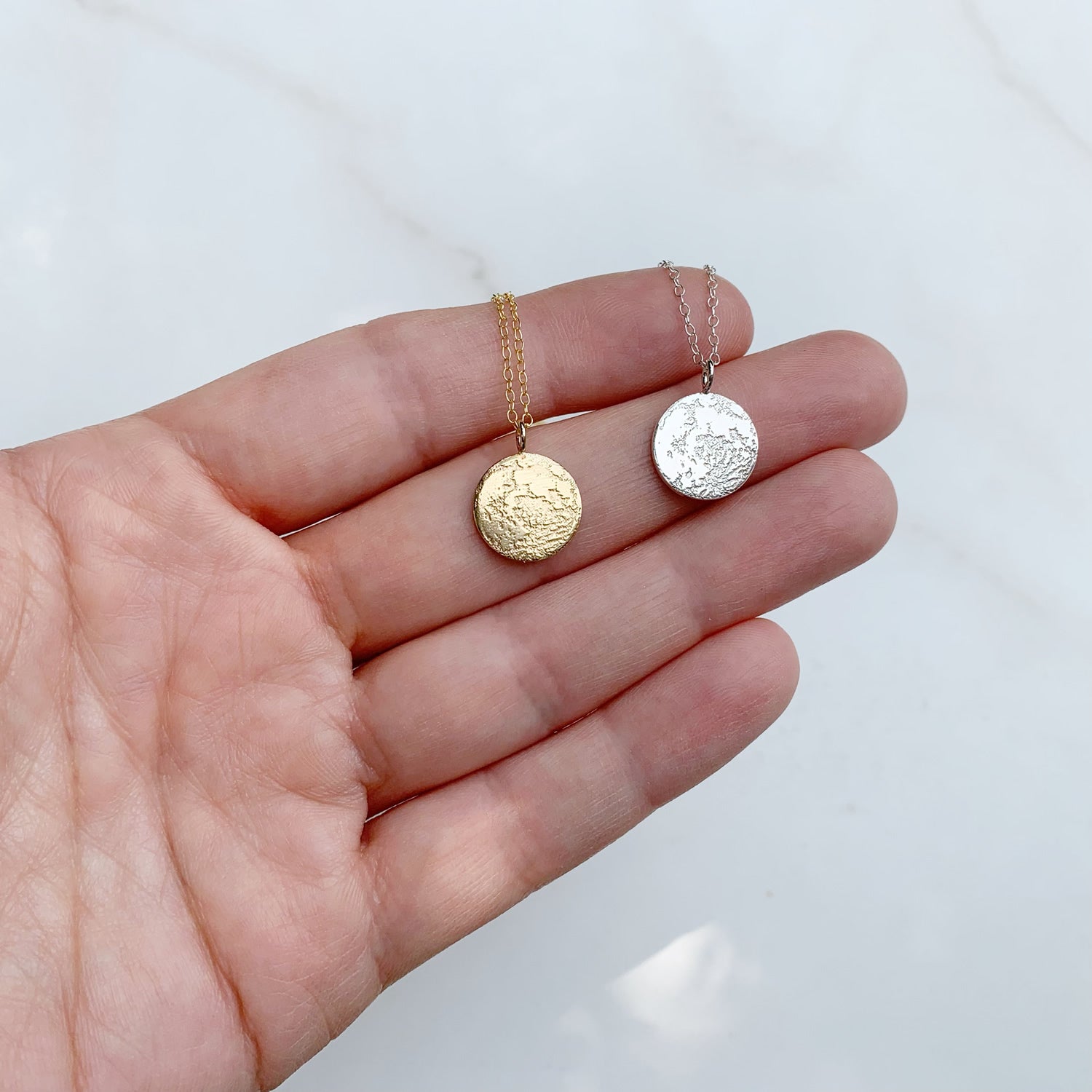 An incredible, realistic full moon is etched on sterling silver and hangs from a delicate, yet sturdy chain. This sweet little moon makes the perfect gift!