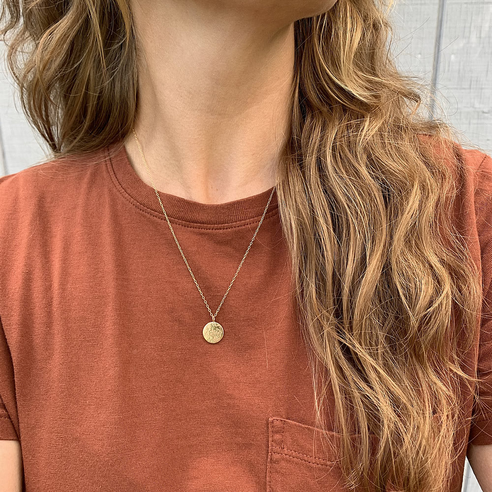 The pendant is available in sterling silver or gold vermeil (a thick layer of 14k gold plating over sterling silver), with a sterling silver or 14k gold filled chain.